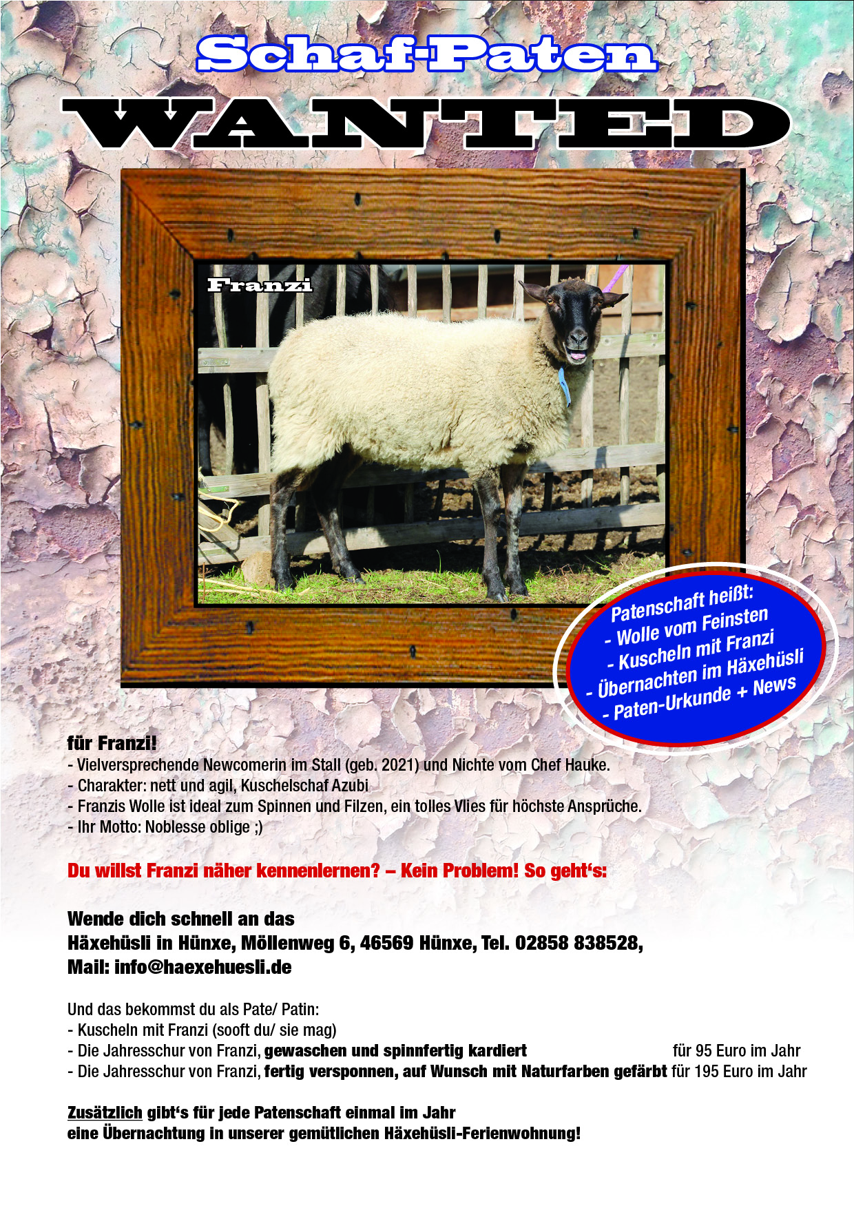 WollpatenschaftWer gerne spinnt und seine Wolle etwas persönlicher hätte: Wir bieten für ein paar unserer Schafe bieten wir Wollpatenschaften an. Unsere Franzi (siehe Flyer) sucht noch.